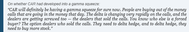 The analyst confirmed that by the time of the interview, the $CAR situation had developed a gamma squeeze component layered on top of the structural short squeeze, with options dealers acting as forced buyers through delta hedging obligations.