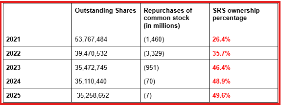 Source: Fugazi Research analysis. Outstanding shares and repurchase data derived from Avis Budget Group, Inc. Definitive Proxy Statements (Form DEF 14A), fiscal years 2021 through 2025, filed with the U.S. Securities and Exchange Commission. SRS Investment Management ownership percentages were derived from Schedule 13D/A filings and DEF 14A beneficial ownership tables for the corresponding periods. All filings are available at SEC EDGAR.