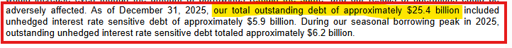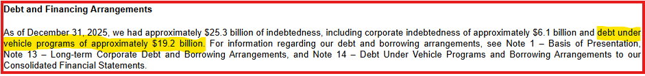 Total indebtedness stands at $25.3 billion ($6.1 billion in corporate debt and $19.2 billion in asset-backed vehicle program debt) against a business that has not generated positive GAAP earnings in two consecutive fiscal years.