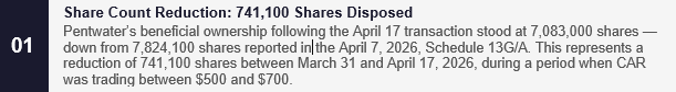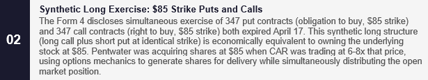 What the numbers above fail to capture is the secondary architecture that transformed a fundamentally distressed business into the most structurally violent short squeeze since GameStop. Two institutional funds (SRS Investment Management and Pentwater Capital Management) accumulated combined economic exposure exceeding 100% of Avis Budget Group’s shares outstanding, SRS through nine years of debt-funded float engineering that installed its own partners as CEO and Executive Chairman, Pentwater through a systematic accumulation culminating in a full repositioning to unhedged long exposure in March 2026 via its Merger Arbitrage Master Fund. Together, they held the float hostage. The result was a prisoners’ dilemma that held the stock at prices six times its fundamental value until April 22, 2026, when the announcement of Q1 earnings on April 29 collapsed the remaining runway simultaneously for both funds, the leveraged long overhang liquidated in a single session, and the stock fell 40% in one day. What remains (a company with negative equity, 8x leverage, $6.8 billion in mandatory vehicle purchases due in twelve months, and a Moody’s downgrade window opening in August 2026) must now be priced on fundamentals alone.