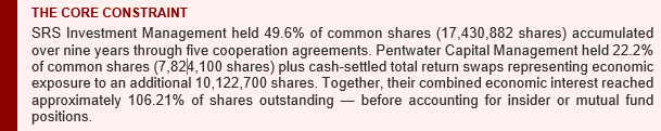 SRS Investment Management has spent nine years building something that does not yet have a formal name, but its shape is unmistakable. A controlling position exceeding the entire non-affiliate public float. A board fixed at five or six members by their cooperation agreement. A transfer restriction clause ensures that any future buyer of their block must maintain the governance structure they designed, which is the organizational architecture of an owner preparing to formalize what is already functionally true: a private company in plain sight.