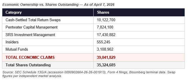 The analyst’s figure of 10,122,700 shares in cash-settled swap exposure matches the ownership decomposition table he published publicly, which showed total economic claims of 39,041,829 shares against 35,324,685 shares outstanding (a structural overhang of approximately 10.5%).