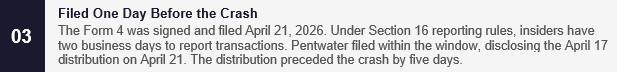 On April 21, 2026 (one day before the crash) Pentwater Capital Management LP and Matthew Halbower filed a Form 4 disclosing transactions dated April 17, 2026. The filing reveals the following: