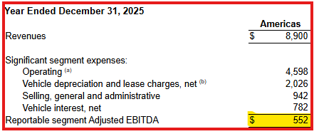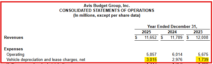 Vehicle depreciation and lease charges rose 73% in two years, from $1.739 billion in 2023 to $3.015 billion in 2025. America’s revenue per day declined 3%. America’s Adjusted EBITDA collapsed 75%, from $2.2 billion to $552 million.