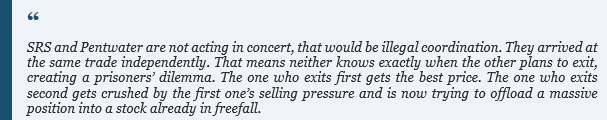 Neither fund was acting in concert. Explicit coordination between them would constitute illegal market manipulation. As a result, each operated in informational isolation regarding the other’s exit intentions. This is the precise condition that makes a prisoners’ dilemma structurally unstable: both parties have a dominant incentive to act first, but neither can observe the other’s move in real time. The prisoners’ dilemma framework was independently corroborated by two market analysts whose public commentary arrived at substantially the same structural conclusions through different investigative paths. This convergence strengthens the analytical foundation of our thesis.