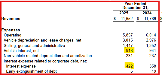 Today, the cost of the debt is rising faster than the revenue it supports. Vehicle interest expense reached $918 million in 2025. Corporate interest expense rose 18% in a single year to $422 million. Total annual interest expense across corporate and vehicle programs stands at $1.34 billion. Against the adjusted EBITDA of $748 million, the all-in coverage ratio is 0.56x. The business generates 56 cents of adjusted earnings for every dollar of interest it owes.