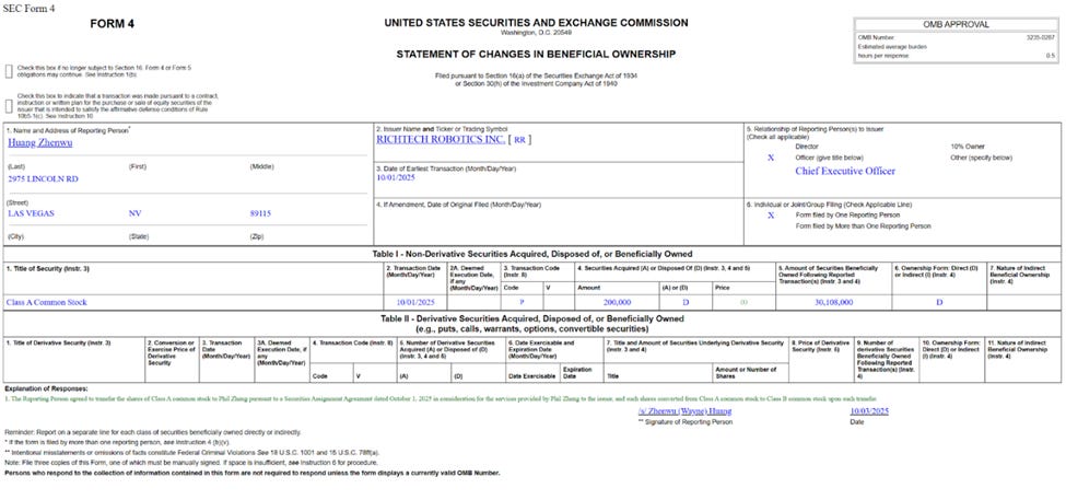 On October 1, 2025, received 200,000 additional Class A shares from Huang “for services provided,” later converted to Class B—preserving insider control while diluting common shareholders.