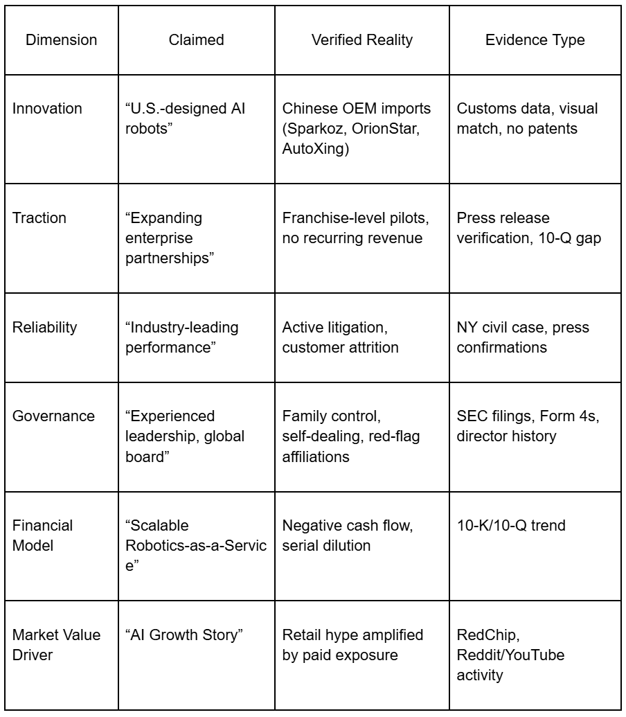 Implication: When identical hardware is available from the original factories, Richtech’s claimed design advantage disappears. The firm functions as a marketing-driven reseller, not a proprietary manufacturer.