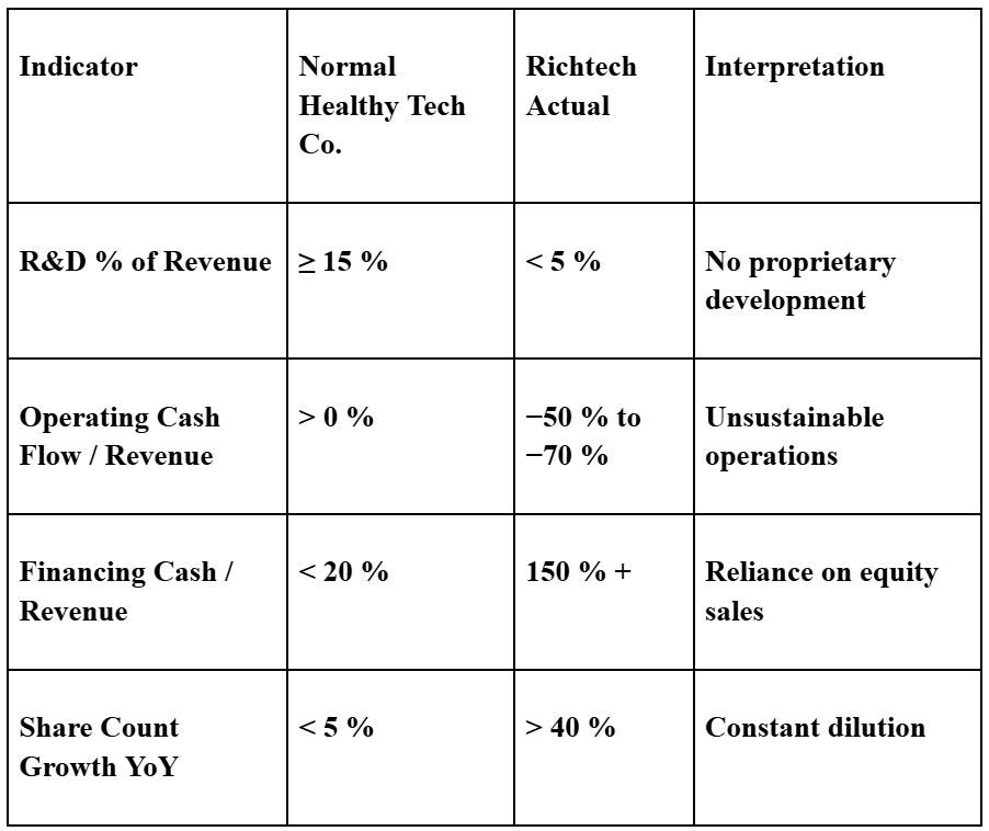 Richtech’s financial mechanics complete the Illusion Loop: each promotional surge creates liquidity for the next equity issuance. Capital markets, not customers, fund the business.
