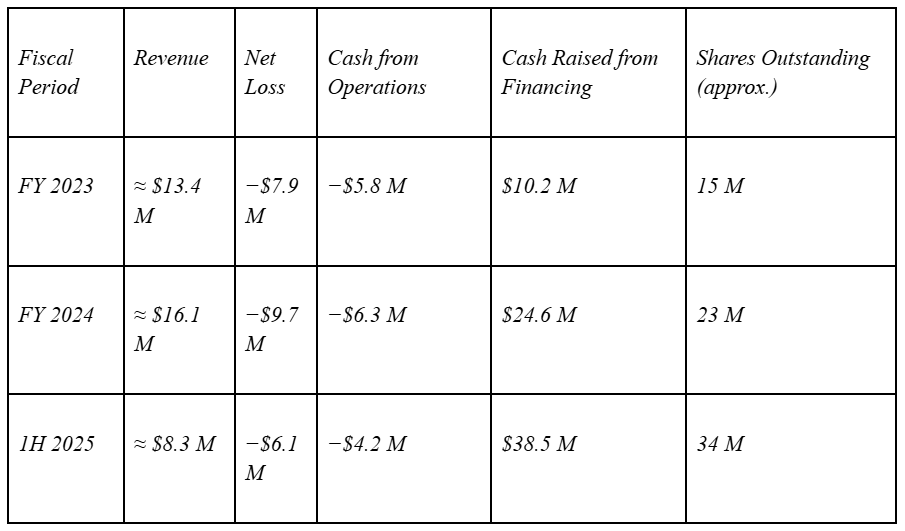 Timed dilution: Share-price spikes consistently preceded or coincided with financing events. In early 2024, the company secured a $50 million Standby Equity Purchase Agreement, and by September 2025, it had filed to register up to $1 billion in new securities—each timed near retail-driven highs.