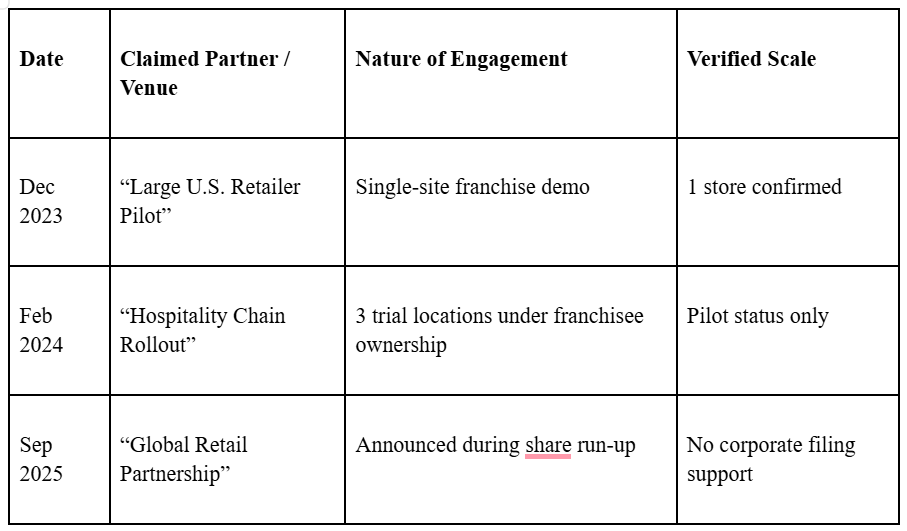 Scale inflation: Announcements reference “national retailers,” yet verification shows single-site or franchisee pilots.
