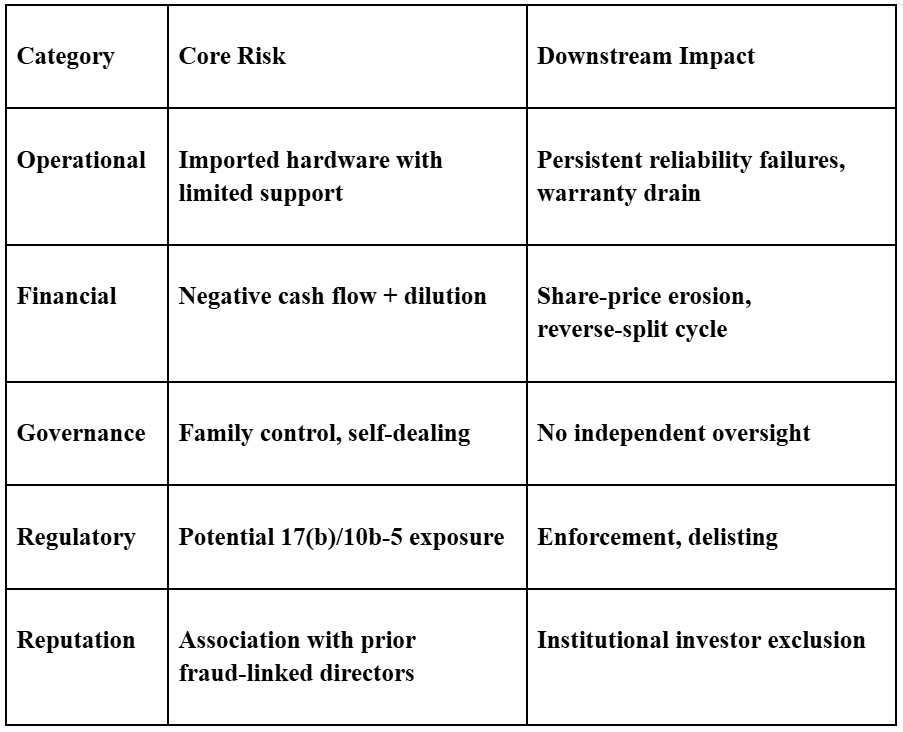 The uploaded snapshot illustrates a core contradiction: while insiders tightened their grip on voting control and issued themselves cheap equity, Richtech’s operational results worsened. Revenue remained flat, while operating losses expanded—underscoring a capital structure designed for control and promotion rather than performance. In this context, governance risk isn’t theoretical; it’s visible on the P&L